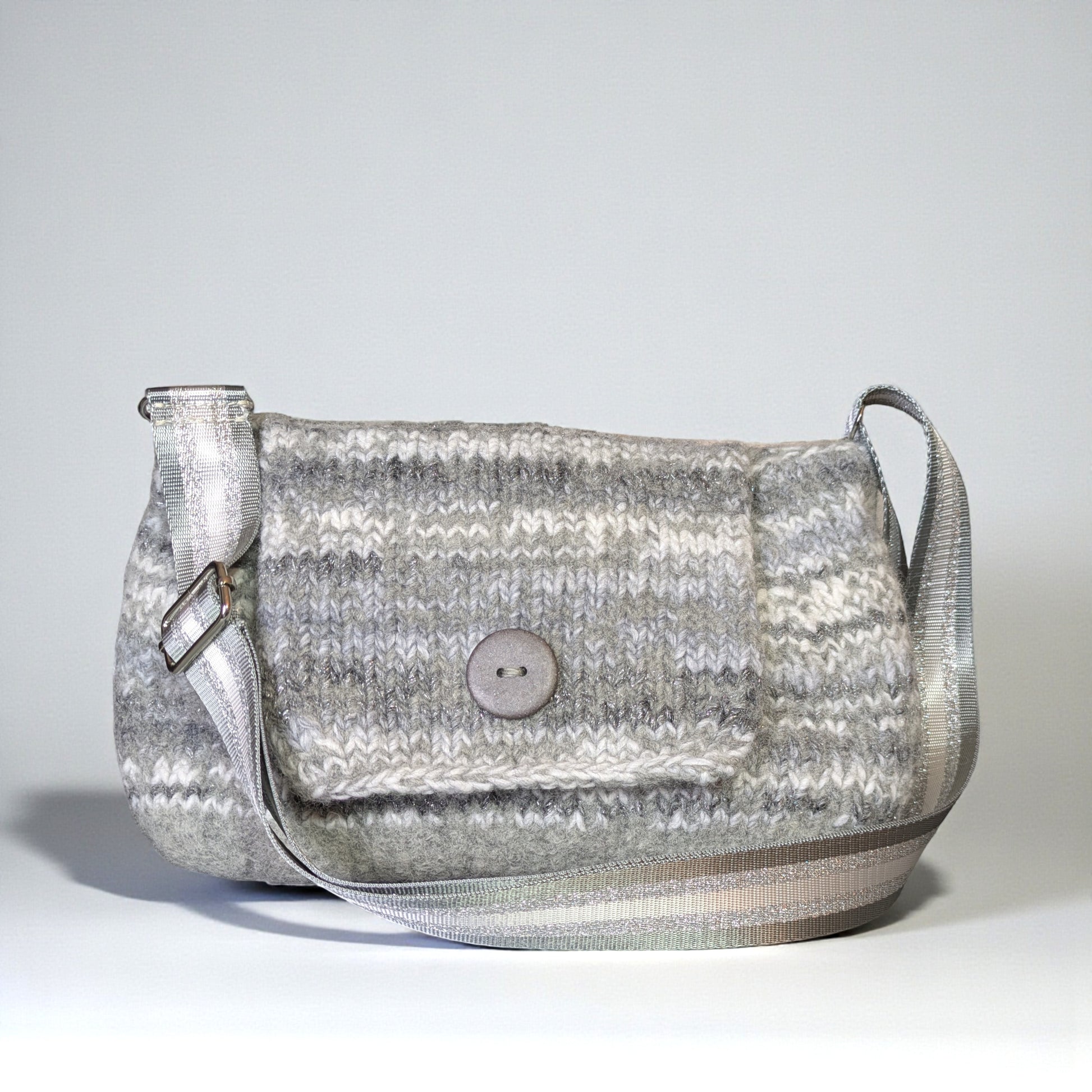 This beautifully textured purse blends multiple shades of gray together for a soft, timeless look that pairs effortlessly with any outfit. Hand-knit and felted from 100% wool, it offers a naturally sturdy structure while keeping a warm, cozy feel. A fun fact about this purse is it's handcrafted resin button made from epoxy resin and mica powders.